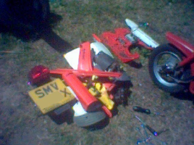 Unfortunately back in 1998 after leaving it at work, someone I knew and worked with decided (without my permission) that he'd cut the locks off and drill the steering lock out so he could strip it down to use in a Moped Mayhem event. When I went back to work I noticed my bike wasn't where I left it, and started asking questions. I eventually found it under the shop in a half stripped state (see pics). After going to have a chat to the bloke, I went back to a mates house, but I didn't know things were about to get worse.